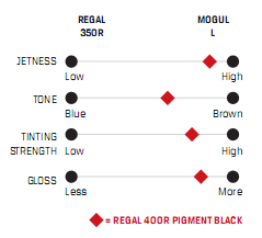 Regal 400R 和MOGUL L、350R炭黑在黑度、色調(diào)、著色、強度及光澤方面的對比: