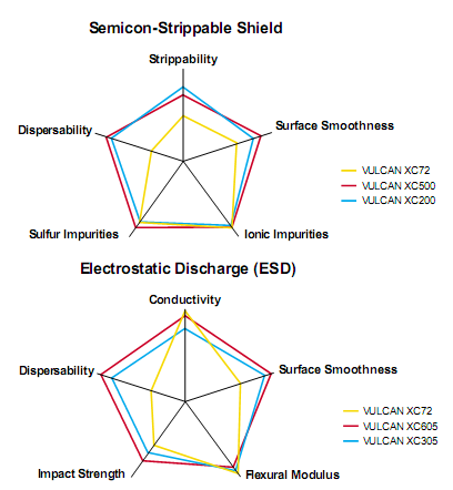 以下是卡博特導(dǎo)電炭黑VXC-72和其他型號炭黑在分散性、表面光潔度、沖擊強(qiáng)度及電導(dǎo)率等方面的對比圖: